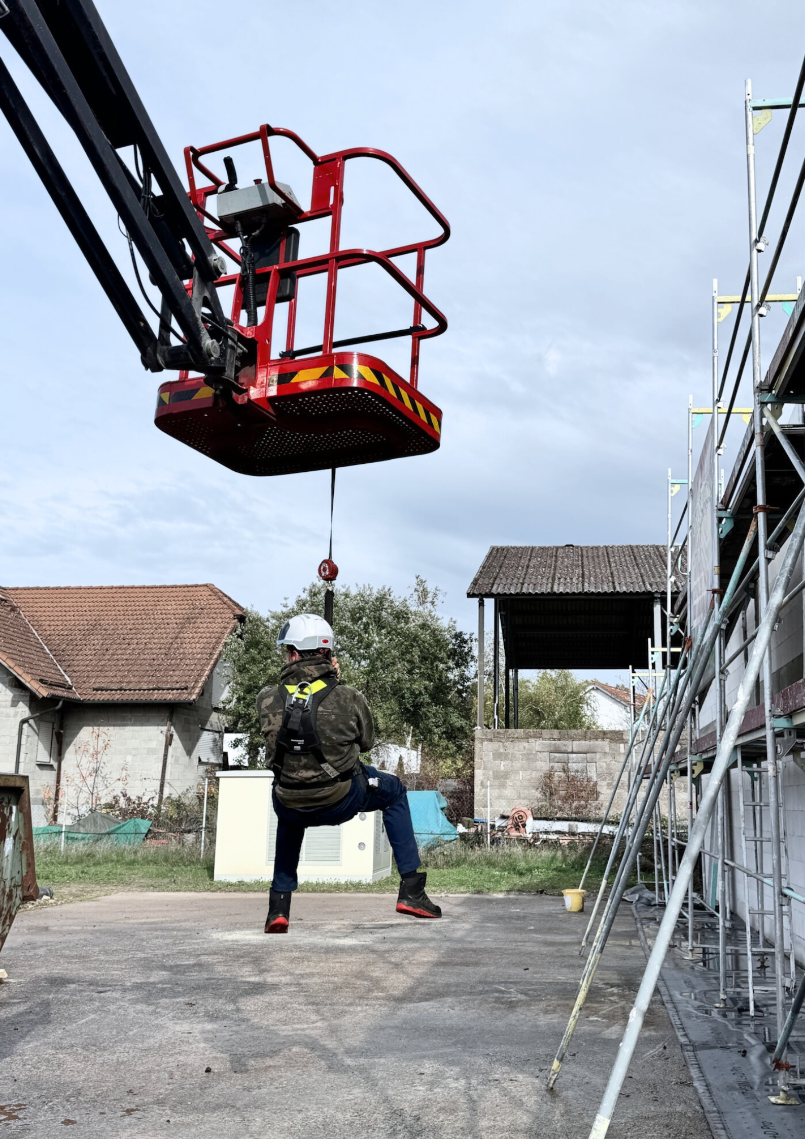 Als Abschluss der gemeinsamen Ausbildung gab es eine Rettungsübung. Geübt wurde das Herausfallen eines Mitarbeiters aus dem Arbeitskorb. Hängend im Auffanggurt war es die Aufgabe der Teilnehmer mittels Notsteuerung den „verunfallten“ Mitarbeiter abzulassen und Maßnahmen aus dem Rettungskonzept einzuleiten.
