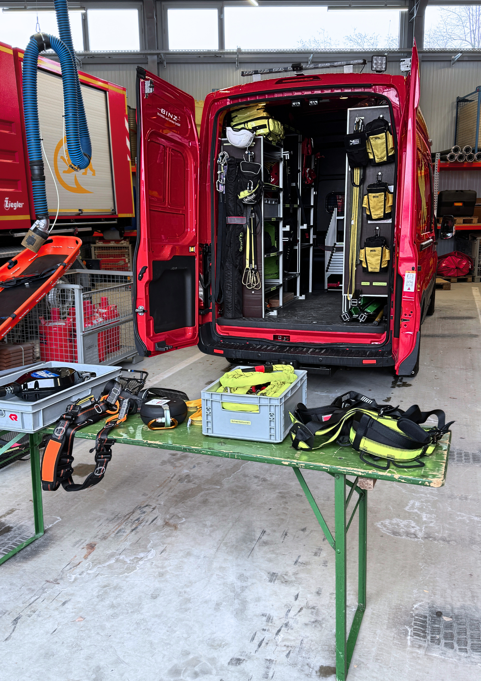 In der Kombination von redundanten Systemen, konnte die SRHT-Einheit innerhalb der Unterweisung auch den Kran zur Menschenrettung mittels Schleifkorbtrage und Abseilvorrichtung inkl. Retter nutzen.