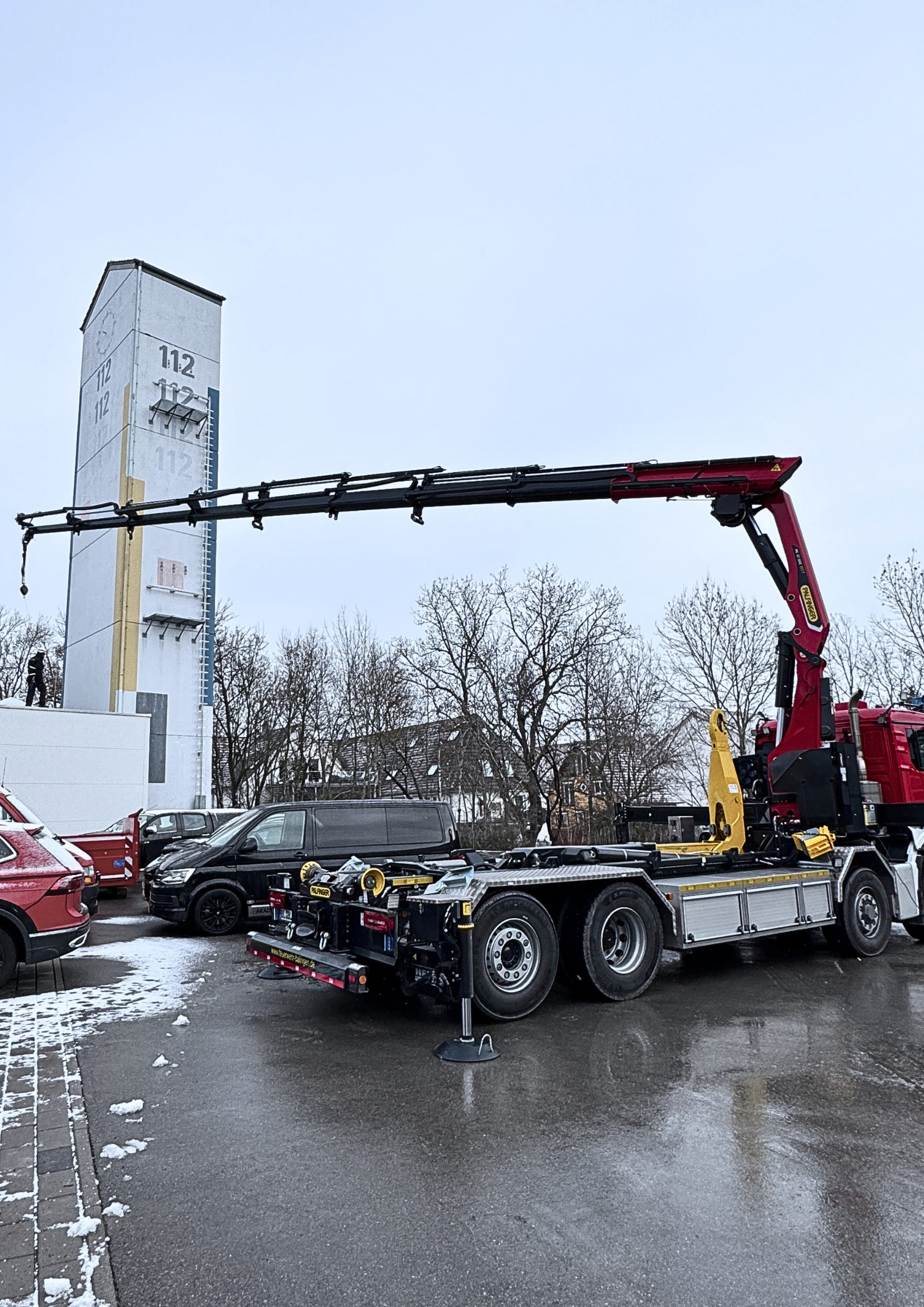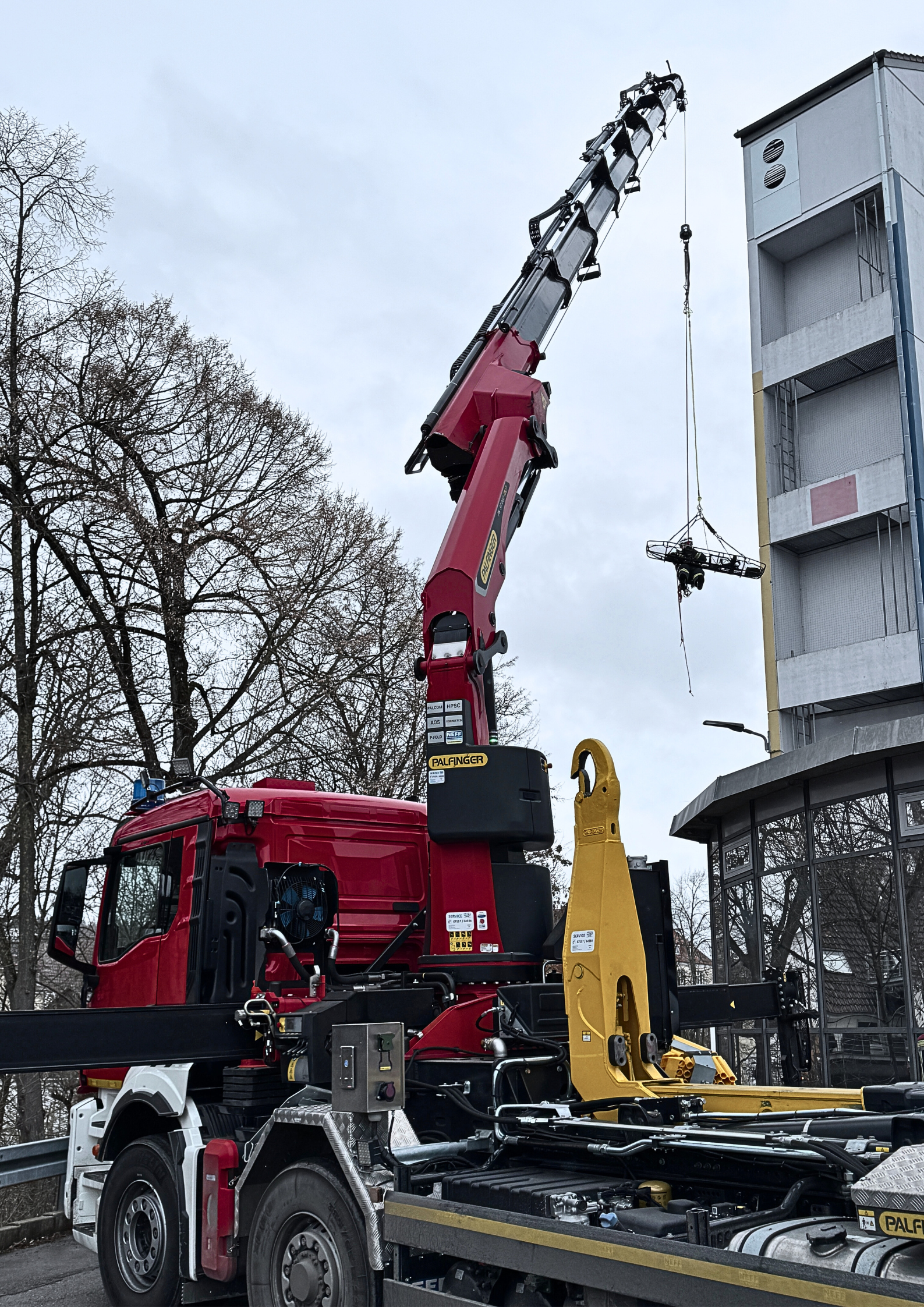 Der vorhandene Wechsellader mit Kran verfügt über einen Personensicherungsmodus.